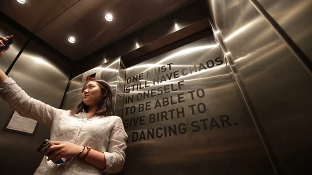 This project explores the issues of self-identity and self-creativity. Located on an elevator door, the text from Friedrich Nietzsche encourages viewers to think about individual identity on the inside, and recognize the chaos in our unique identity that allows for creativity to develop our own ideas and explanations.